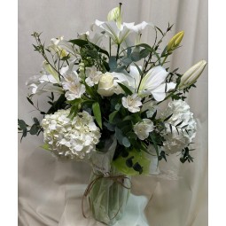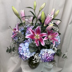 Hortensias en lila con lilium oriental rosa acompañado de...